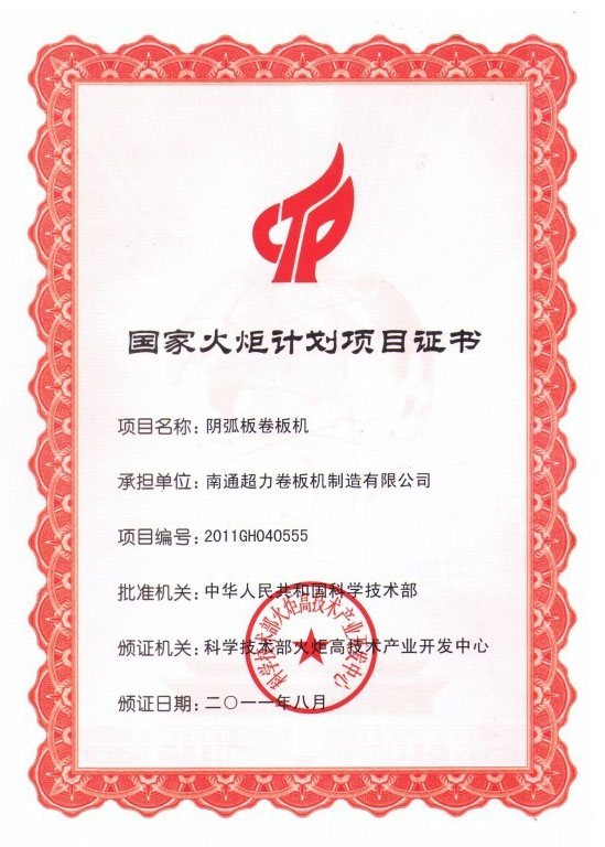今年2月,南通超力卷板機(jī)制造有限公司正式接受到國(guó)家科技部頒發(fā)的“陰弧板卷板機(jī)”火炬計(jì)劃項(xiàng)目證書。至此,該火炬計(jì)劃項(xiàng)目正式立項(xiàng)。